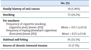 Table 1 shows the baseline demographic data of the participants. Regarding risk factors, the most prevalent risk factor was habitual biting (31.5%), followed by smoking (24.2%). Only 2 participants reported alcohol consumption (Table 2). Concerning the outcomes, only 4.7% of the screened sample reported previous screening for oral cancer (Table 3).