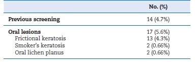 Resultados: O estudo visava 398 funcionários, 96 dos quais recusaram participar. Por conseguinte, foi efetuado um rastreio oral a 302 participantes. Os resultados revelaram zero tumores malignos orais, mas foram detetados achados orais em 17 participantes: queratose por fricção em 13 (4,3%), queratose do fumador em 2 (0,7%) e líquen plano oral em 2 (0,7%), que é uma lesão oral potencialmente maligna. A irritação crónica e o tabagismo foram os únicos fatores de risco significativamente associados às lesões.