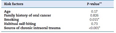 No oral malignancies were detected, and only 0.66% of cases showed OPMLs in the form of oral lichen planus (OLP). None of the 5.6% who showed oral keratosis and OLP were aware of their lesion. Among the risk factors, both smoking and chronic intraoral trauma were significantly common among patients with oral lesions compared to those lesion-free (p=0.015 and p<0.01, respectively) (Table 4).