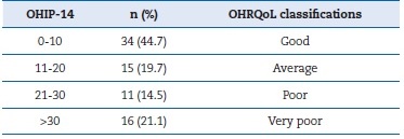 The OHIP-14 results (Table 1) revealed that 44.7% (n=34) of the sample classified their OHRQoL as good. In turn, 35.6% (n=27) considered that they had a very poor or poor OHRQoL.