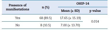 Table 2. Relationship between the presence of oral manifestations at the beginning of chemotherapy and the Oral Health Impact Profile-14 (OHIP-14).