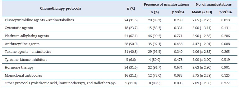 Table 3 shows that only 9% of patients received just one protocol. The most commonly used protocol was platinum-alkylating agents (67.1%; n=51), followed by anthracyclines (50.0%; n=31). The taxane antimitotic protocol triggered oral manifestations most often (93.5%), and only monoclonal antibodies showed a significant difference (p=0.035). The anthracyclines protocol caused the highest number of oral manifestations (p=0.008).