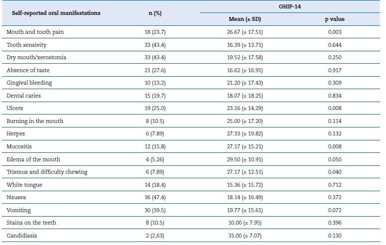 The participants reported 275 oral manifestations, such as tooth sensitivity, xerostomia, nausea, and vomiting. Self-reported manifestations of tooth and mouth pain (p=0.003), ulcers (p=0.008), mucositis (p=0.008), mouth swelling (p=0.050), and trismus (p=0.040) were associated with worse OHIP-14 results and, thus, negatively with QoL (Table 4).