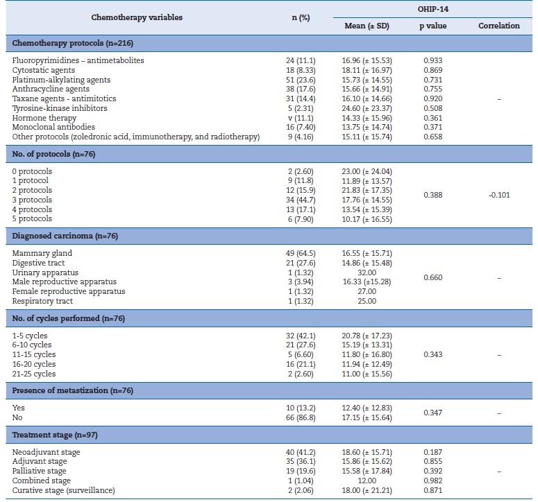 Table 5. Relationship between the Oral Health Impact Profile-14 (OHIP-14) and chemotherapy variables.