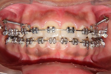 Fixed orthodontic treatment was performed with 0.022 MBT bracket prescription (3M Unitek) bonded on the maxillary and mandibular dentition. The sequence of arch wire was 0.016” nickel-titanium wire, 0.016” x 0.022” stainless-steel wire, 0.017” x 0.025” stainless-steel wire, and 0.018” x 0.025” stainless-steel wire (3M unitek). After initial leveling and aligning, distal movement of the maxillary dentition was initiated in the maxillary arch on the 0.018” X 0.025” stainless-steel wire.