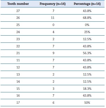 The patients’ mean age was 17.13 ± 7.81 years. The intraclass correlation coefficient was 0.82, indicating good reliability. OIIRR was present in almost all the teeth, except the left second premolar. The prevalence of OIIRR was greater in molars and incisors and least in the premolars. The percentage of distribution was highest in the right maxillary first permanente molar (68.8%), followed in descending order by the right maxillary central incisor (56.3%), the left and right maxillary second permanent molars (50% and 43.8%), the maxillary right central and lateral incisors and the maxillary left permanente second molar (43.8%), the maxillary left first premolar (25%), the maxillary right second premolar (18.3%), and the maxillary first premolar and the canines of both sides (12.5%). Only the maxillary left second premolar did not show the presence of OIIRR (0%) (Table 1). In the molars, the prevalence of OIIRR was highest in the distobuccal root, followed by the mesiobuccal root and the palatal root.